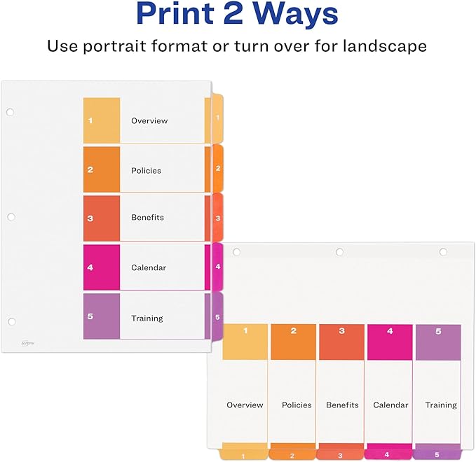 Avery Dividers for 3 Ring Binders, 5 Tabs per Set, Customizable Table of Contents, Multicolor Tabs, Great for Organizing Reports, Projects, and More (11131)