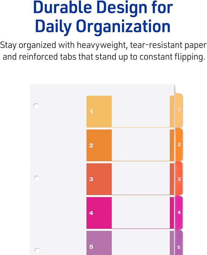 - 3 sets of 5 dividers are paper with durable hole and tab reinforcements for long-lasting binder organization