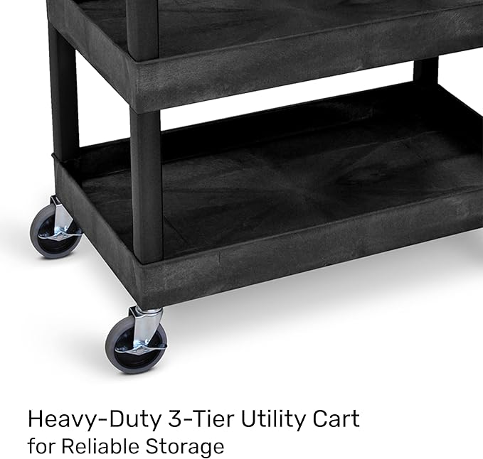 Tubstr 3-Tier Rolling Utility Cart with Wheels | Supports 300 lbs. Total | Heavy-Duty Capacity for Garage Storage, Office Spaces, & Kitchen Use | Durable Tool Cart with Locking Wheels (Black, 32 x 18)
