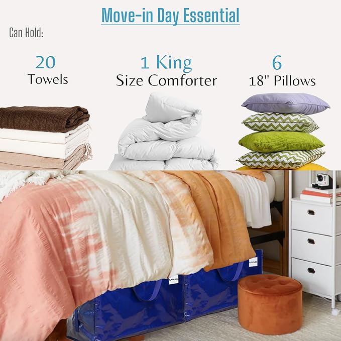 - Multi-Functional:Versatile and multi-purpose, suitable for moving, storing, transporting, laundry, camping, traveling, organizing, space-saving, under-bed storage, small trips, etc. Ideal for moving into your new apartment or college dorm room, storing winter clothes and bedding in your wardrobe, and keeping pillows and blankets clean and dust-free for guests during RV trips. Great for storage in your closet, garage, basement, attic, or storage unit.