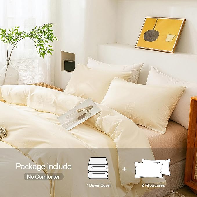 ECOCOTT Duvet Cover Queen Size - 3 Piece 100% Washed Cotton Bedding Set, Soft and Breathable with Zipper Closure & 8 Corner Ties - Comfortable and Stylish for All Seasons (Cream)