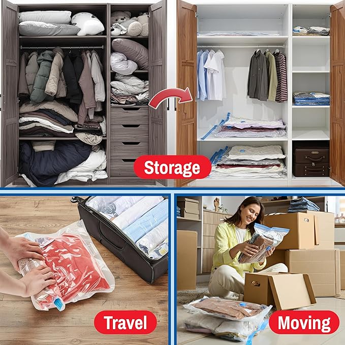 - Complete Set with Pump: Includes 4 small vacuum sealed bags and a portable hand pump. Use these space-saving packing bags for moving, travel, dorm storage, or home improvement projects.
