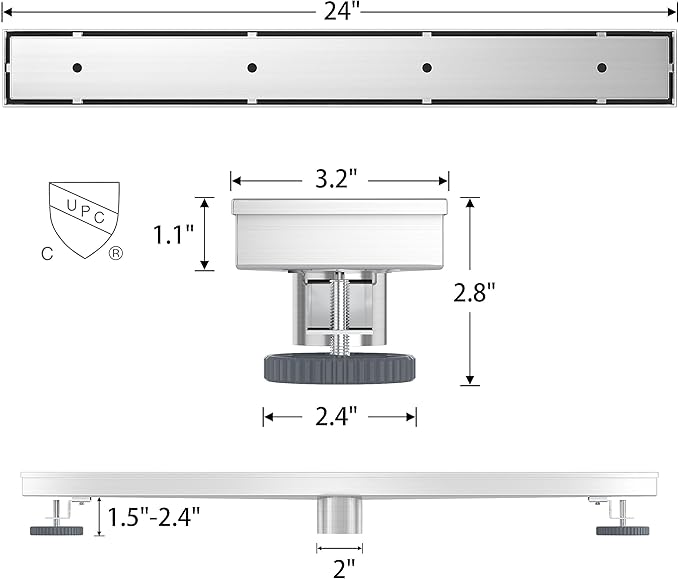 - Material & Reliability - This 24 inches tile insert linear drain is made of US ASTM standard 304 Stainless Steel. Brushed nickel surface finish, effectively prevents corrosion and rust. Linear shower drain with tile insert grate truly achieve invisible visual effects. Perfectly blend in the modern decor. The product has passed the WATERMARK and CUPC certification, ensuring safety and reliability during use.
