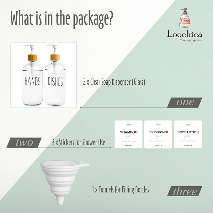 - HANDS & DISHES Clear Dispensers For Kitchen Use - Bottles contain Hands and Dishes marks on the bottle. If you are having problems mix up or get asked “Which Soap is Which?", this would solve this problem well. The label is not only good for distinction glass soap dispenser with pump but also looks elegant.