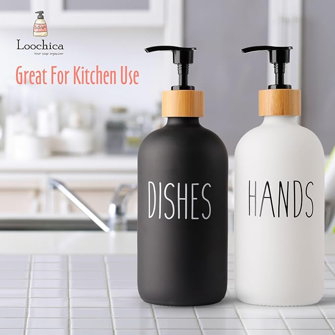 - HANDS & DISHES For Kitchen Use - Bottles contain Hands and Dishes marks on the bottle. If you are having problems mix up or get asked “Which Soap is Which?", this would solve this problem well. The label is not only good for distinction glass soap dispenser with pump but also looks elegant.