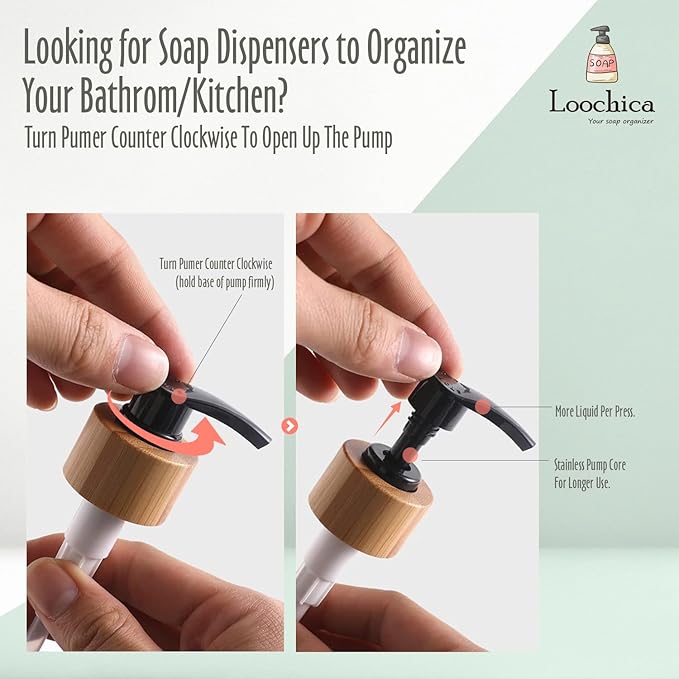 - PREMIUM QUALITY & DURABLE- This soap dispenser set is made of thick quality glass, matched with a bamboo soap dispenser pump. Our soap dispensers are durable for years. Premium 2CC pump provides more liquids per press.
