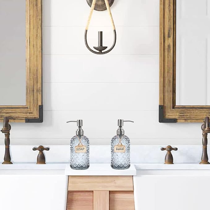 16 oz Diamond Pattern Glass Soap Dispenser, Kitchen and Bathroom Refillable Soap Dispenser with Rust Resistant Stainless Steel Pump for Hand Soap, Lotion Glass Liquid Dispenser(Grey-2pack)
