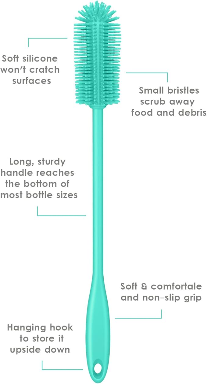 - Deep Cleaning: Designed to reach down into every nook and cranny, the silicone brush keeps your favorite bottles and glassware squeaky clean; the brush itself repels odors and stains and is easy to clean, just throw in your dishwasher