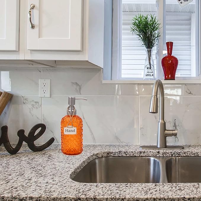 16 oz Diamond Pattern Glass Soap Dispenser, Kitchen and Bathroom Refillable Soap Dispenser with Rust Resistant Stainless Steel Pump for Hand Soap, Lotion Glass Liquid Dispenser (Orange)