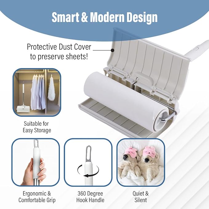 - SMART & MODERN DESIGN: With our modern, free-standing design, the roller comes with a dust-proof cover and can be stored easily anywhere in your home, leaving no dust or unwanted things to be stuck and preserving stickiness on the adhesive sheets. Also, compared to a vacuum cleaner, the lint roller will not disturb your family, roommates, colleagues, etc. with no loud noise-cleaning. Our 360-degree ergonomic hook handle feature allows the lint roller to be hung anywhere in your house.