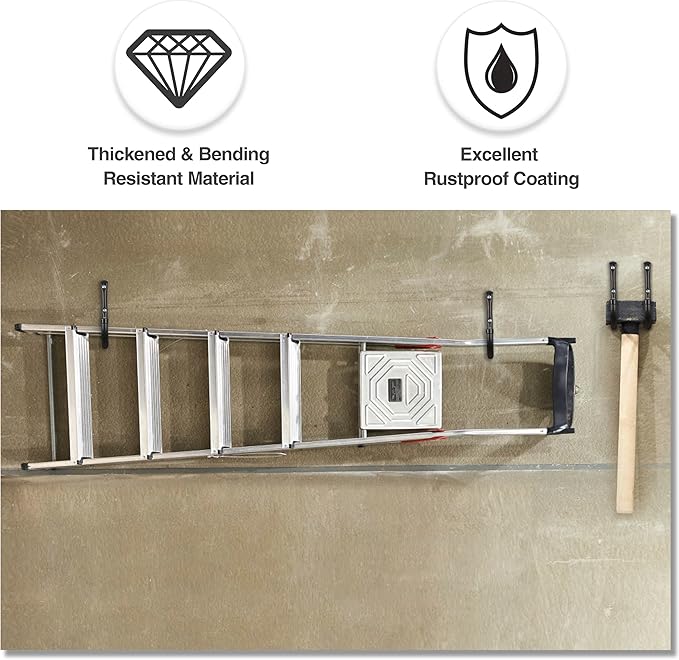 - EXCELLENT LOAD-BEARING STRENGTH - our heavy duty ladder garage storage hooks are made of thicker carbon steel with a new bending method, which makes them strong enough to accomplish hanging tasks for heavy objects without bending. This allows them to be used in garages, workshops, and warehouses.