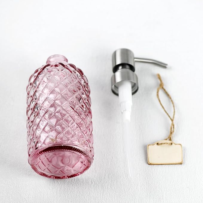 16 oz Soap Dispenser with 304 Rustproof Stainless Steel Pump, Kitchen, Bathroom Refillable Glass Liquid Soap Dispenser for Hand Soap, Soap, Lotion. (Pink)