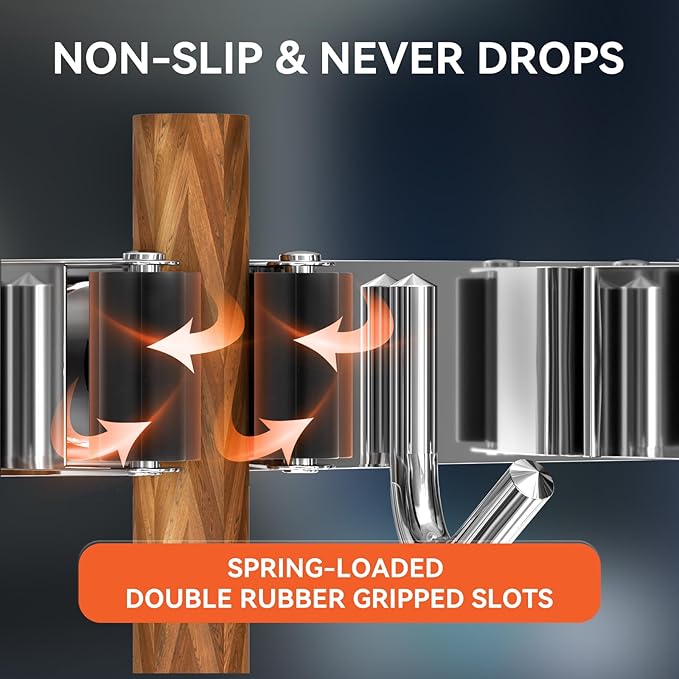 - 🏡【NON-SLIDE DESIGN】Each rack of the mop and broom holder wall mount features an adjustable triangular design. The spring-loaded, double rubber gripped slots can keep a stronger hold on your items with diameter of 0.7 inch-1.3 inch. Whether wet mops or baseball bats won't slip.