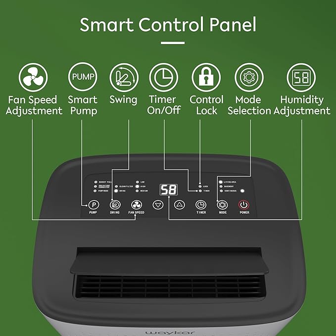 - Full Functionality: This dehumidifier offers a superior user experience with customizable settings for living spaces, basements, and continuous dehumidification. You can set your desired humidity level and choose from 3 wind speeds. The swing function changes wind direction, while automatic defrosting and cleaning reminders ensure optimal performance. It also features a timer and Control Lock for safety and convenience.