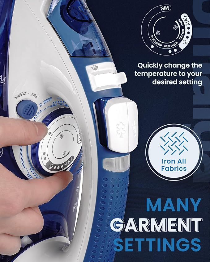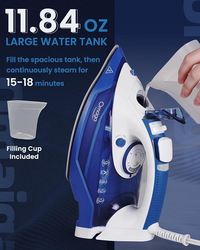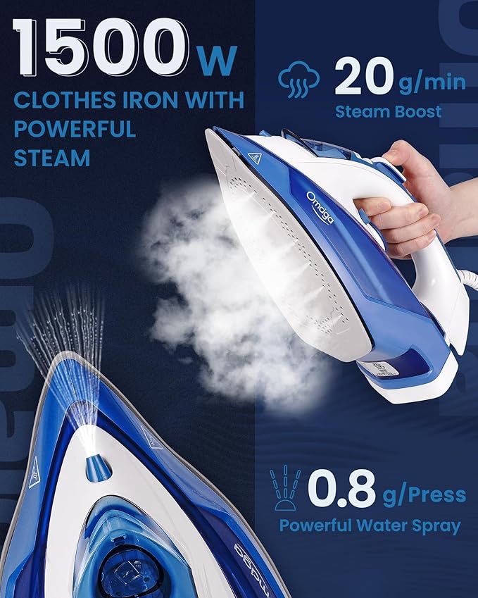 - ššššš & šš š šššššš: The OMAIGA 1500W clothing iron offers superior wrinkle removal, easily tackling the most stubborn creases. It provides 20g/min of continuous steam, effectively removing stubborn creases from all kinds of fabrics. With up to 0.8g/shot of steam burst, it softens the wrinkles in your clothes. Ideal for sewers, quilters, crafters, and everyday home ironing care.