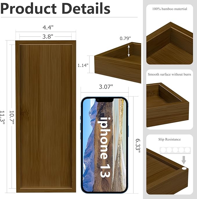 - Perfect Size and Durability: Our decorative tray, measuring 11.3’’x 4.4’’x 1.14’’, showcases your items beautifully. Crafted from premium bamboo, it's easy to clean and built to last, ensuring long-lasting use