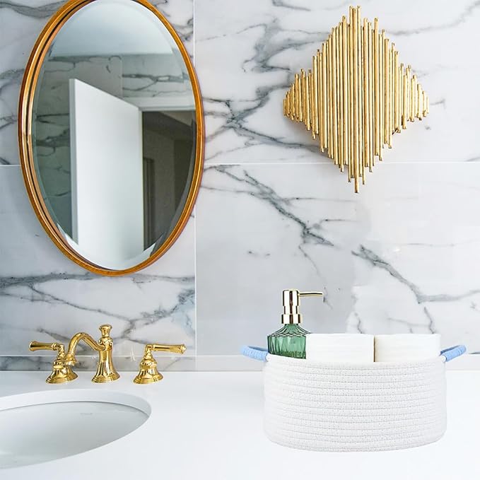 - Versatile Storage for Various Items: Our white & blue basket is a versatile storage solution that can hold a variety of items, from baby items to hair accessories, and even cosmetics, keys, remote controls, makeup brushes, sunglasses, wallets, and other miscellaneous items. It's the key to keeping your living room, bedside table, dresser, shelf, and entryway organized and clutter-free