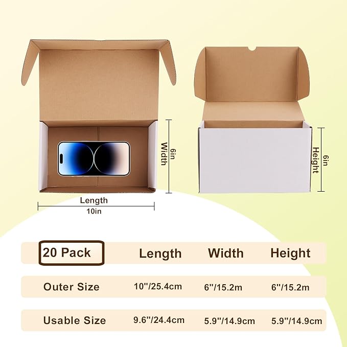 - Dimension: The white shipping boxes with an outer size of 10'’x6''x6'', and a usable size of 9.6''x5.9''x5.9''. With 20 packs of our affordable shipping boxes, it is suitable for packaging small business.