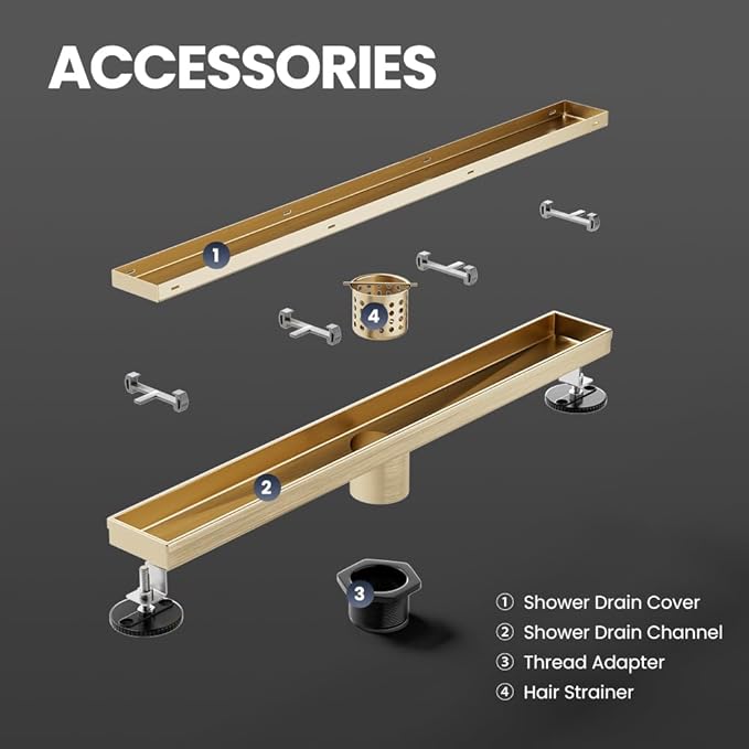 - What You Get: LISEEGO Linear Shower Drain, 2-Adjustable Foot, 1-Hair Strainer, 1-hook, 1-Adapters, our worry-free 3-year warranty, and friendly customer service.