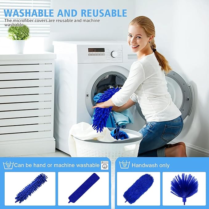 - 【Flexible, Washable & Detachable Dusters】: The ceiling fan duster is so flexible that it can be bent to any angle, cleaning all kinds of dead corner and hard-to-reach areas. The long cobweb duster with extension pole is built-in with flexible materials, making the ceiling fan cleaner easy to clean and reusable. Just slide the head off the dust wand and hand wash with warm water.