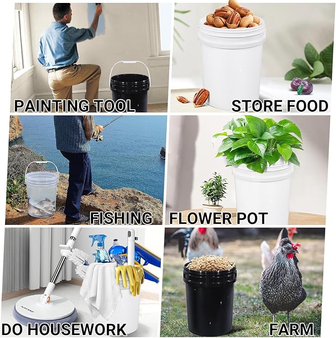 - Multi-Use & Easy Carry These 5 gallon buckets are highly versatile, equipped with a durable metal handle for easy transport. Indoors, use them as home storage (for rice, flour, snacks) or a cleaning bucket (such as a mop bucket or car wash bucket) to access supplies conveniently. Outdoors, they function as a bait bucket (including live bait bucket) for fishing, a water bucket for gardening, or a paint bucket for DIY projects. They even double as halloween buckets for candy—kids can grip the handle securely and carry them with ease. One set meets all your home and outdoor needs.