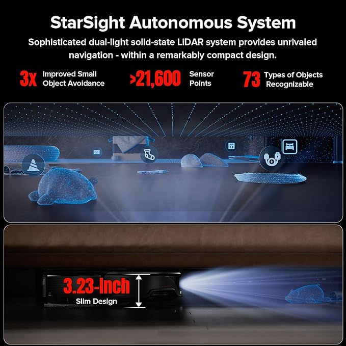 - StarSight Dual Light Solid-State LiDAR - As Roborock's latest innovation, the system provides a comprehensive 3D understanding of the surroundings, enabling precise navigation with pinpoint precision and accurate mapping, even in challenging areas, such as under suspended cabinets and around thin-legged furniture. Powered by 3D sensors that capture precise outlines of obstacles and an RGB camera for visual recognition, Roborock Qrevo Slim swiftly recognizes and evades 73 types of objects