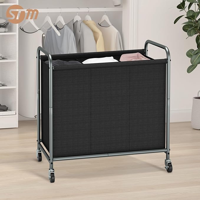 STORAGE MANIAC Rolling Laundry Hamper, 165L Laundry Basket with Lockable Wheels, Triple Clothes Sorter Cart, 3 Bag Clothes Separator Hamper for Closet, Bathroom, Laundrys Room, 3 Section Black