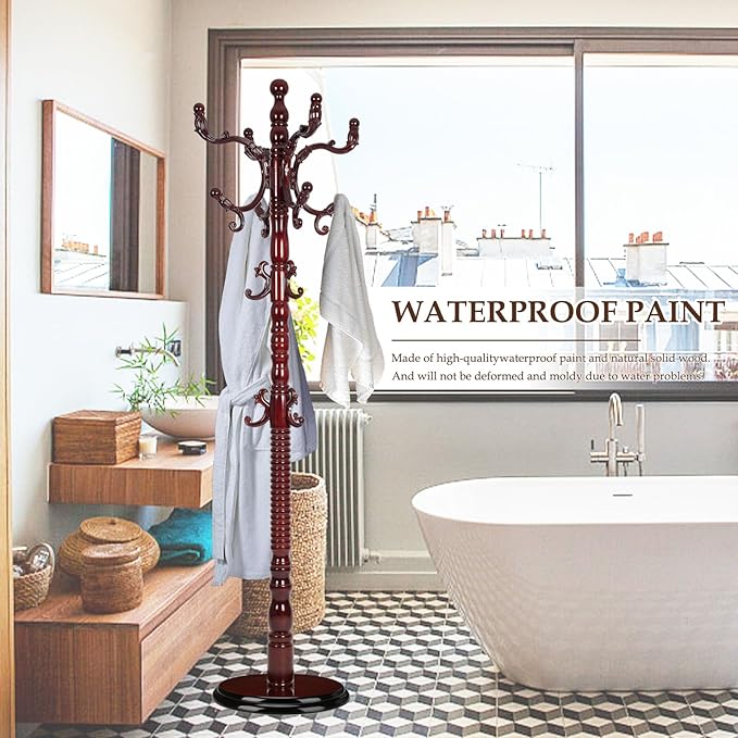 - 【A Stable Tree】 What good is a coat rack that falls over the moment you put a coat on the hook? Our coat tree made with 3.14" bold, solid wood pole and 13.4" diameter heavy-duty disc base, so you can tidy your room with confidence.