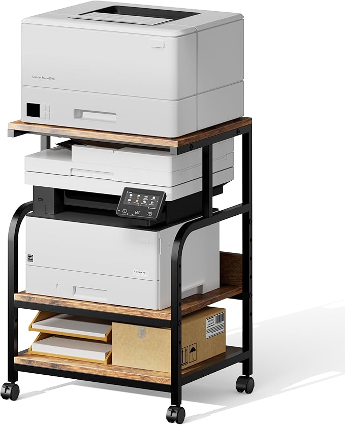 - 【Customizable Height for Versatile Storage】 Transform your compact workspace with 5-level adjustable height (9.45" range) on the middle shelf! Perfectly adapt for bulky laser printers, 3D printer stands, or mini fridge stands by tailoring tier spacing. Measuring 19.68”Wx15.75”Dx27.55”H, this space-saving printer table for home office maximizes vertical storage without sacrificing mobility. Industrial steel frame and 110 lb/shelf capacity ensure wobble-free stability even during high-volume printing. Optimize tight spaces as a mobile printer cart or under desk printer stand!