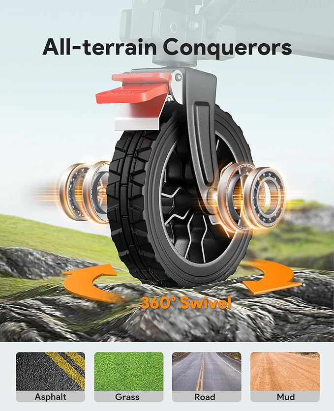 - ๐๐น๐น-๐๐ฒ๐ฟ๐ฟ๐ฎ๐ถ๐ป ๐ช๐ต๐ฒ๐ฒ๐น๐: With all-terrain wheels, this collapsible wagon with wheels can move smoothly on most terrains, such as hard sand, grass, mud, etc. The front wheels can rotate 360ยฐ and come with brakes, allowing you to adjust the direction more flexibly and maintain stability on the slopes. Note: Please do not use it on soft sand.