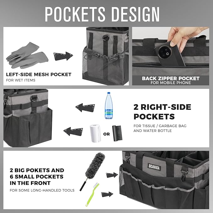 - Exquisite Details: The 5 inner compartments are large enough for organizing cleaning tools. 3 individual deep outer pockets, 1 mesh side pocket and 1 trash bag dispenser allow you storage and access of other cleaning tools. Also, securely zipped pocket is design for safely storing your important items