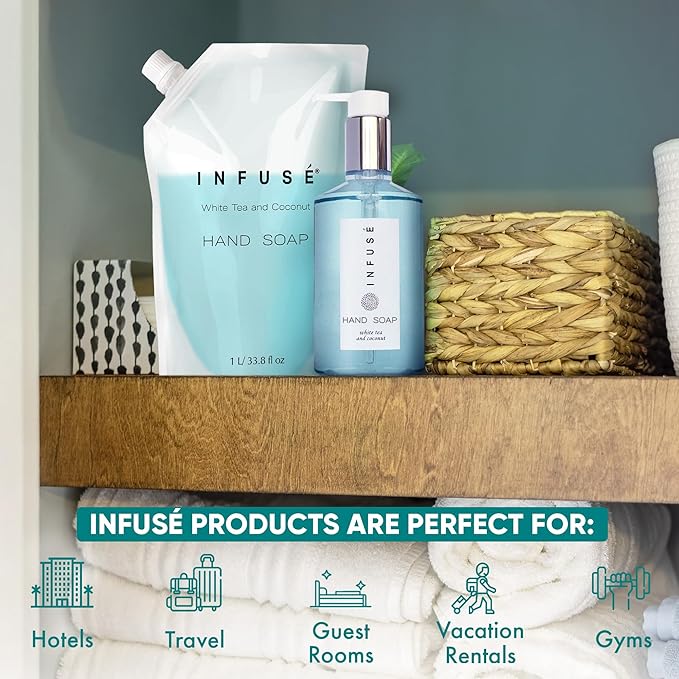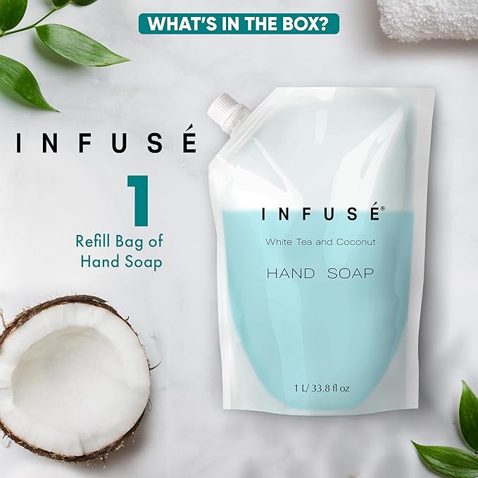 - HOTEL-QUALITY, LUXURIOUS AMENITIES: Enhance your guest experience with the Infuse White Tea and Coconut in a convenient 1-Liter Refill Bag, designed to refill wall-mounted and stand-alone dispensers. Enriched with white tea, coconut, organic aloe, and olive oil, this gentle, daily-use formula suits sensitive skin and hair. Ideal for hotels, vacation rentals, guest bathrooms, and homes, these premium amenities add sophistication and functionality to any hospitality space.