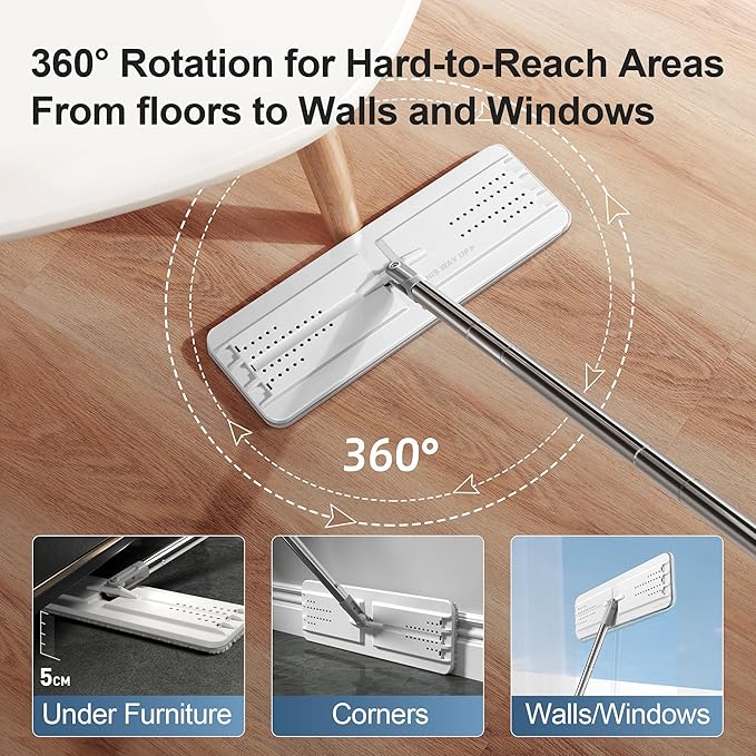 - [Extended Microfiber Mop] With 360°rotation and bigger mop head, the flat mop can reach to any corners, those "under-the-whatever" and more wider places for much faster cleaning job! The adjustable Stainless Steel Handles can be extended from 26.5 to 60.0 inches, great for wet dry mops or dust mops for wall cleaning