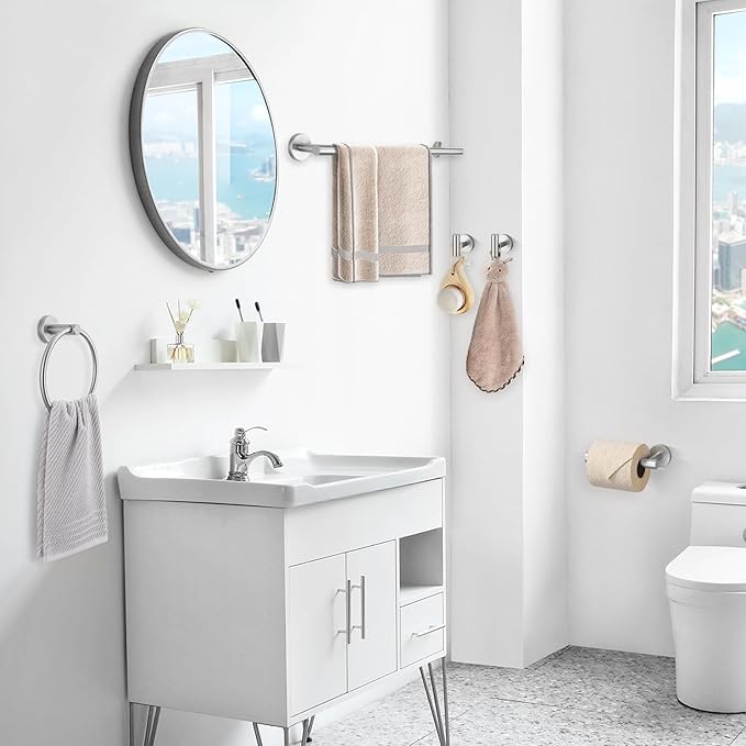 - 【Modern&Safe Design】- The Bathroom Towel Bar Sets features a modern brushed nickel finish makes the product look more beautiful and a unique round shape design without sharp edges avoids scratching the skin, making it safer for you and your family.