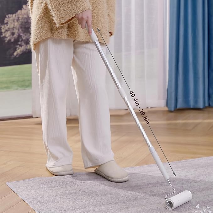 - Extendable Long Handle & Versatile Use: The extendable long handle, made from durable high-quality aluminum alloy, adjusts from 28 to 40 inches in height. The long lint roller sticky mop easily reaches difficult floor corners, curtains, and stairs, ensuring every family member can participate in household chores.