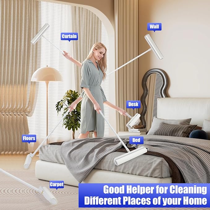 - MULTI-SURFACE PET HAIR TERMINATOR: Engineered for fur-covered surfaces: upholstery, velvet curtains, wool rugs, leather car seats, and delicate fabrics. Safely lifts embedded cat/dog hair, dander, lint balls, and dust—no water, batteries, or messy cleanup required.