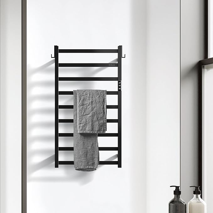 Z&Zhanle Heated Towel Racks for Bathroom, 9-Bar Towel Warmer Rack for Bathroom, Wall Mounted Towel Warmer, Electric Towel Drying Rack with Timer, Carbon Steel Matte Black, Plug-in/Hard-Wired