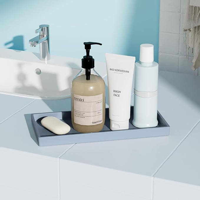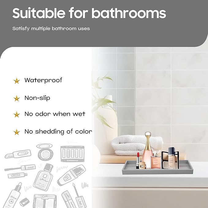 - Easy Clean:Waterproof design suitable for wiping with a damp cloth or rinse clean.Lightweight,resists warping in humidity and dishwasher safe.Recyclable,perfect as a bathroom counter tray,perfume tray or toilet tray