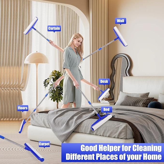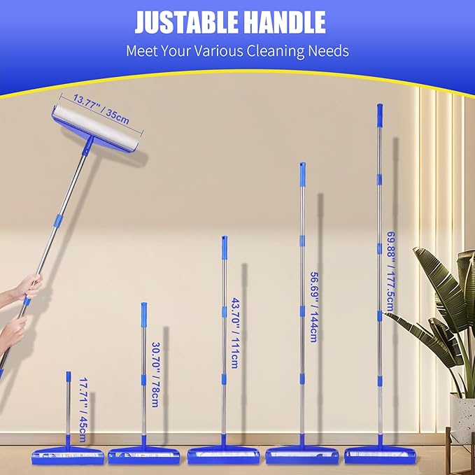 - 69.88" EXTRA LONG HANDLE DESIGN: The furniture lint roller comes with a removable 5-section assembled long handle. The detachable long handle hair remover roller cleans large areas such as floors, sofas, beds, walls and curtains, also apply to smaller areas such as clothing, tables, car seats and more. Detachable design makes cleaning more flexible.