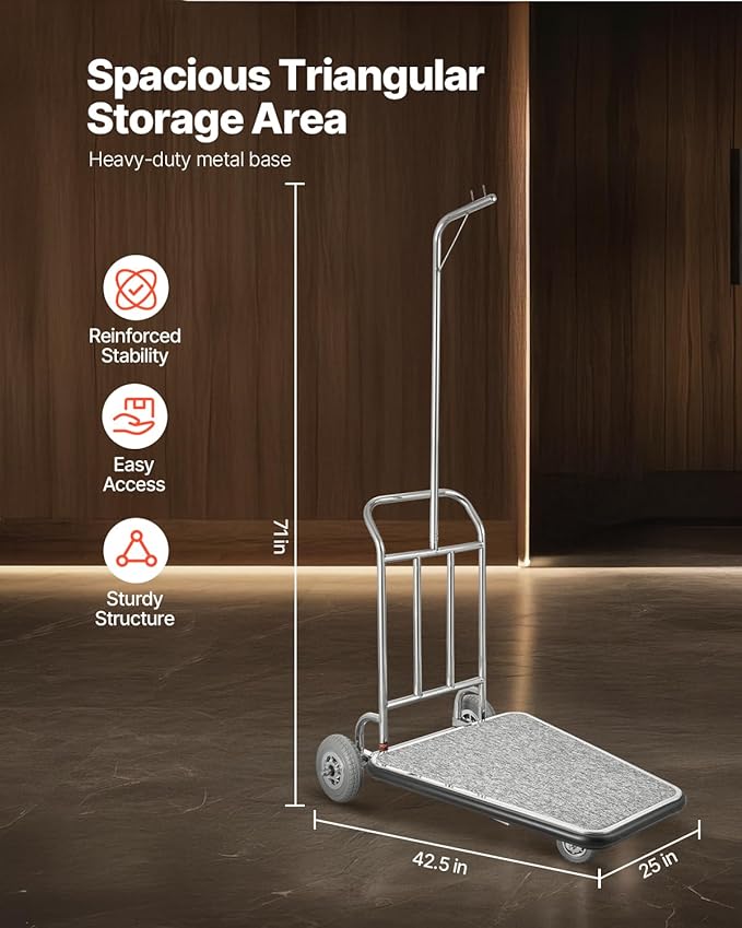 - Protective Design: Keep luggage secure with a detachable clothing rod for hanging, non-slip carpet base, and side rails. Rubber bumpers of our hotel bellman cart absorb shock to secure walls and elevators, and the reinforced steel chassis ensures stable, reliable transport.