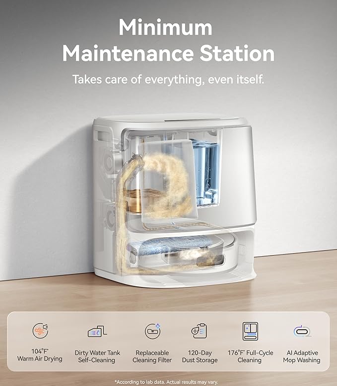 - AI-Adapted Base Station with Full-Cycle Cleaning: The intelligent base station washes the mops with 173°F hot water and dries them with 104°F warm air, keeping the pads fresh and ready for the next use. A 2.5L dust bag stores up to 4 months of debris, while a built-in stirrer prevents messes—delivering a spotless home with minimal effort.