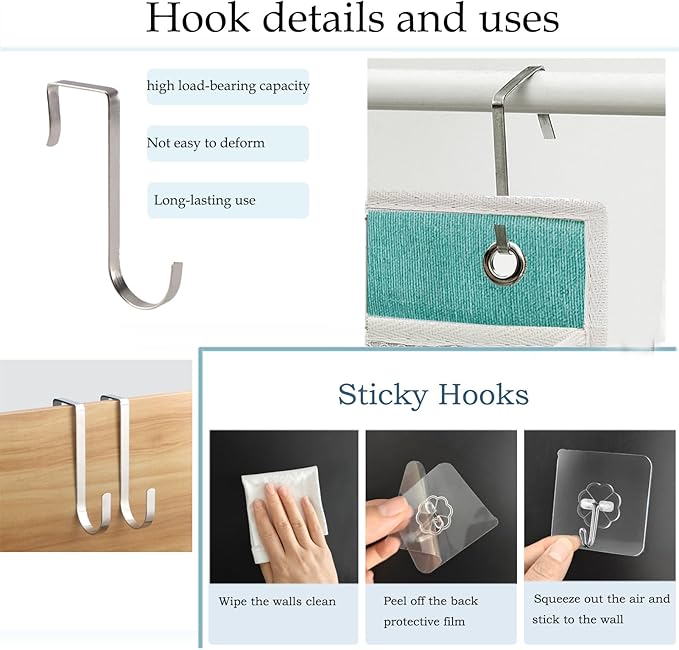 - Multiple Mounting Options – Includes 4 no-drill adhesive hooks + 4 metal hooks for versatile installation on walls, doors, walls or closets—no tools needed! Adapts effortlessly to any space.