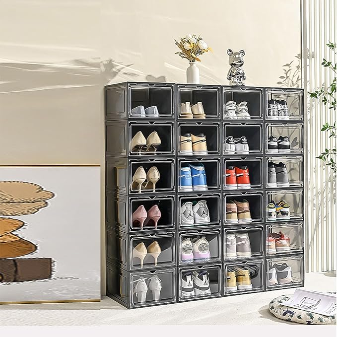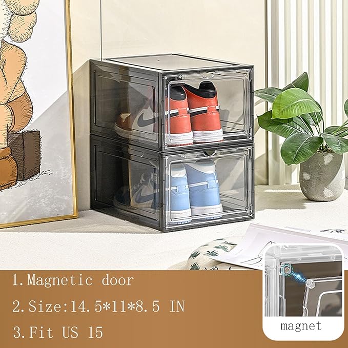 XXL Drop Front Shoe Storage Box Stackable, 8 Pack Shoe Display Case Fit US 15,Sneaker Storage Shoe Containers with Magnetic Door(8 PACK BLACK