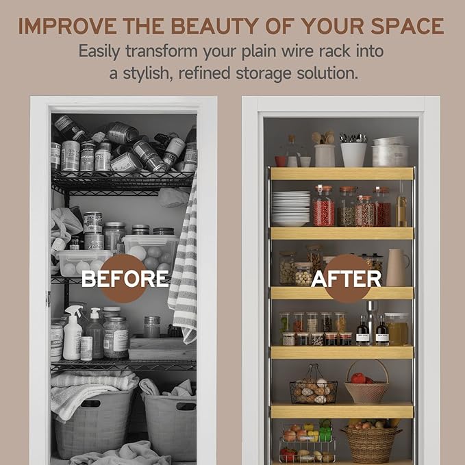 - 【No-Tool, Easy Installation】Forget clips, screws, or brackets. Simply place the wooden covers for wire shelves directly on top of your existing rack — no tools required. A fast, effortless way to upgrade your pantry, closet, or laundry storage.