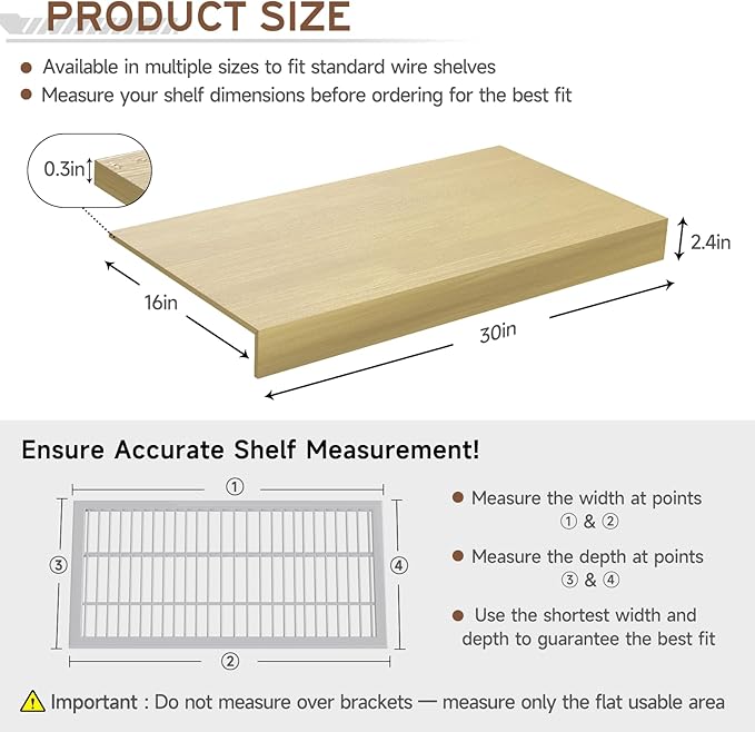 - 【No-Tool, Easy Installation】Forget clips, screws, or brackets. Simply place the wooden covers for wire shelves directly on top of your existing rack — no tools required. A fast, effortless way to upgrade your pantry, closet, or laundry storage.