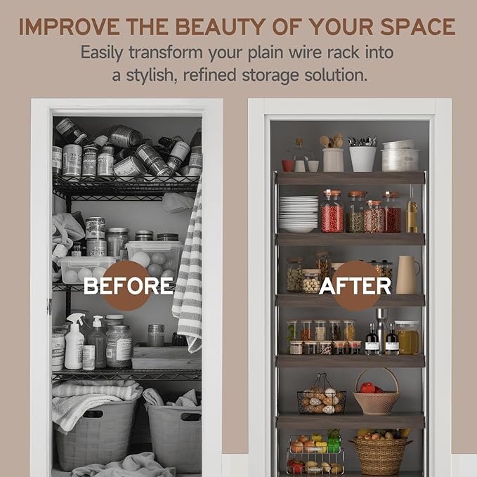 - 【No-Tool, Easy Installation】Forget clips, screws, or brackets. Simply place the wooden covers for wire shelves directly on top of your existing rack — no tools required. A fast, effortless way to upgrade your pantry, closet, or laundry storage.