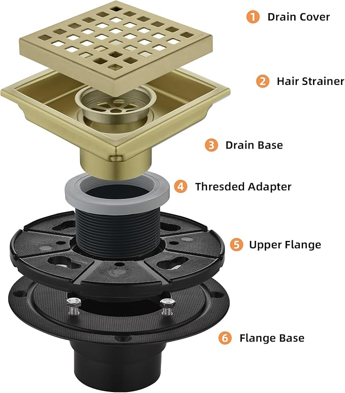 - 【Package】: shower drain kit includes drain body, drain base, hair strainer, threaded adapter, rubber collar and lifting hook