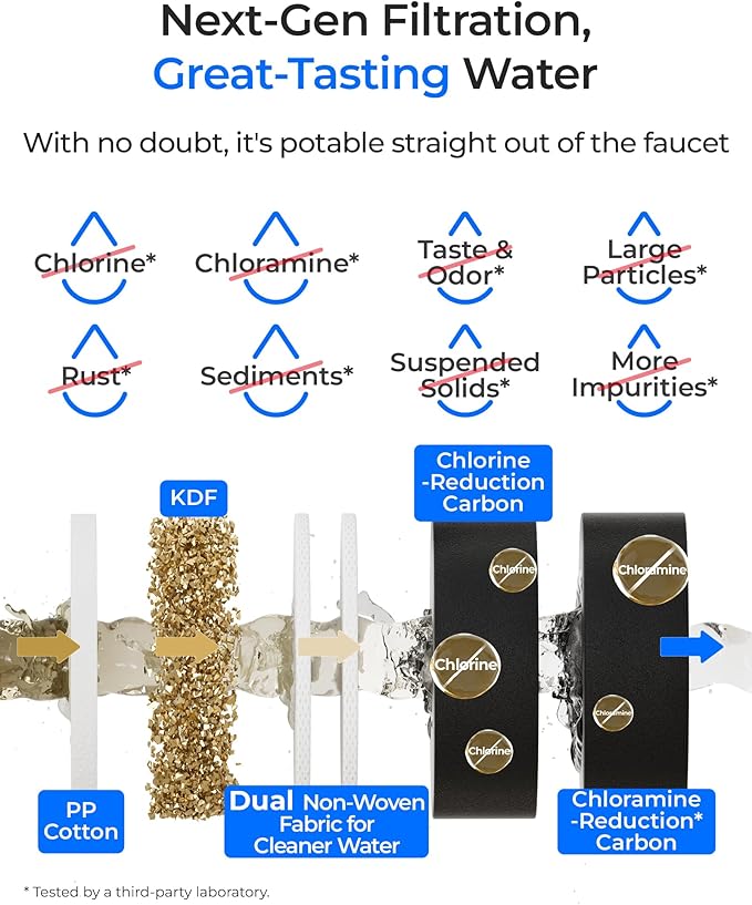 - Next-Gen Filtration for Cleaner Water: This under sink water filter features a multi-layer filtration system with PP cotton, KDF, and dual non-woven fabric to reduce chlorine, chloramine, and other impurities. It effectively reduces large particles, rust, sediments, and more, ensuring great-tasting, potable water straight from your faucet.