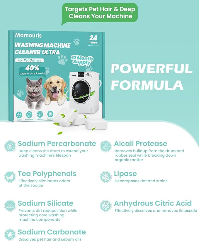 - Septic Safe: Mamouris pet hair remover contain tea polyphenols, lipase, sodium polyacrylate, sodium percarbonate, sodium carbonate and citric acid, specially formulated to remove odours, dirt, and other residue from washing machines. It breaks down naturally without harming septic systems. For peace of mind with every clean
