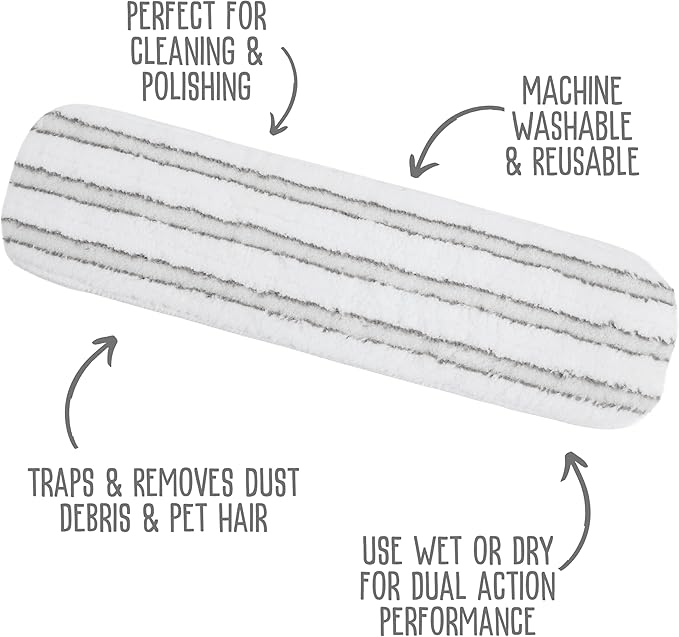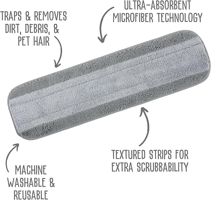 - XL Pads, Built-In Scrubber & Precision Cleaning Spade: Cover more surface in less time with the XL microfiber pads, designed for maximum surface coverage and fewer passes. The integrated scrubbing strip on the mop head tackles stubborn, dried-on messes with ease, while the precision cleaning spade lifts stuck-on debris and buildup from grout lines, corners, and tight edges—leaving every inch spotless
